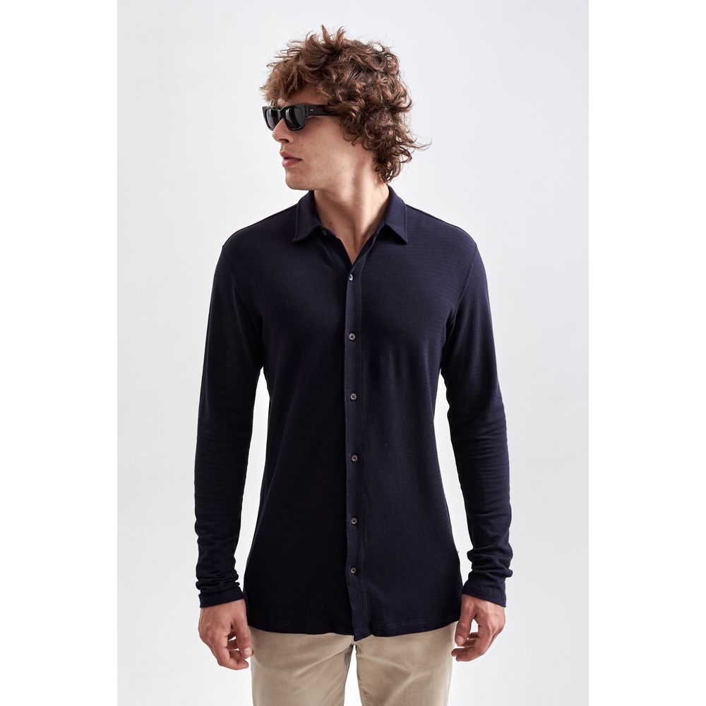 A peça foi idealizada para dias frescos, podendo ser usada tanto como primeira peça quanto como sobreposição. O tecido da camisa conta também com textura desenhada de espinha de peixe, levemente marcadas de maneira uniforme pela peça.