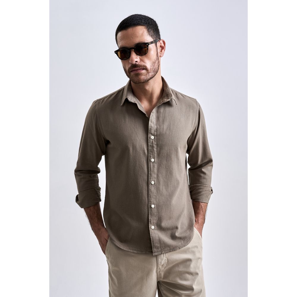 Com modelagem regular, a camisa apresenta gola tradicional e manga longa, oferecendo versatilidade para diferentes ocasiões. Os detalhes incluem botões em massa madre pérola, reforçando o acabamento refinado da peça.