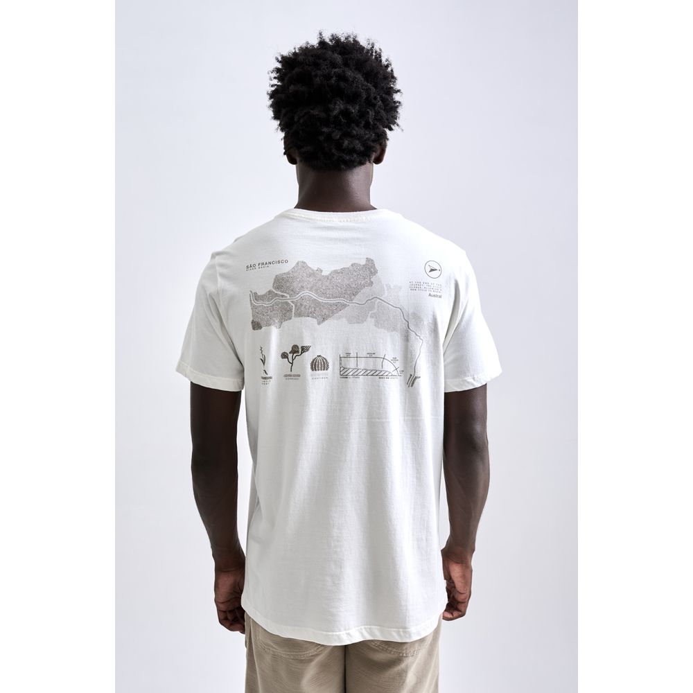 Camiseta em tecido 100% algodão penteado 30/01, pré-encolhida, pré-lavada e amaciada. A peça conta com reforços de costura na gola e nos ombros para melhor estrutura e durabilidade. A estampa é feita com tinta à base d’água, minimizando o impacto ambiental e reduzindo o uso de produtos químicos na confecção da peça.