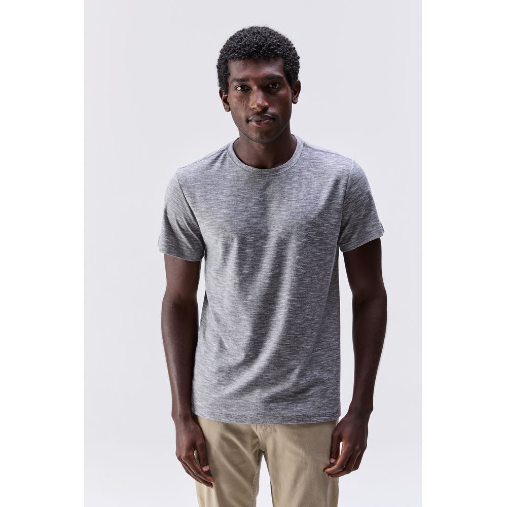 A Camiseta Cartum Flamê é confeccionada em malha Cartum Flamê, 100% linho, oferecendo leveza, respirabilidade e um toque naturalmente fresco, ideal para climas quentes. O tecido é utilizado pelo avesso, revelando um tom mais escuro e uma textura sutilmente irregular, que reforça o caráter artesanal e sofisticado da peça.