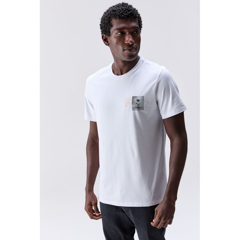 Camiseta em tecido 100% algodão penteado 30/01, pré-encolhida, pré-lavada e amaciada. A peça conta com reforços de costura na gola e nos ombros para melhor estrutura e durabilidade. A estampa é feita com tinta à base d’água, minimizando o impacto ambiental e reduzindo o uso de produtos químicos na confecção da peça.
