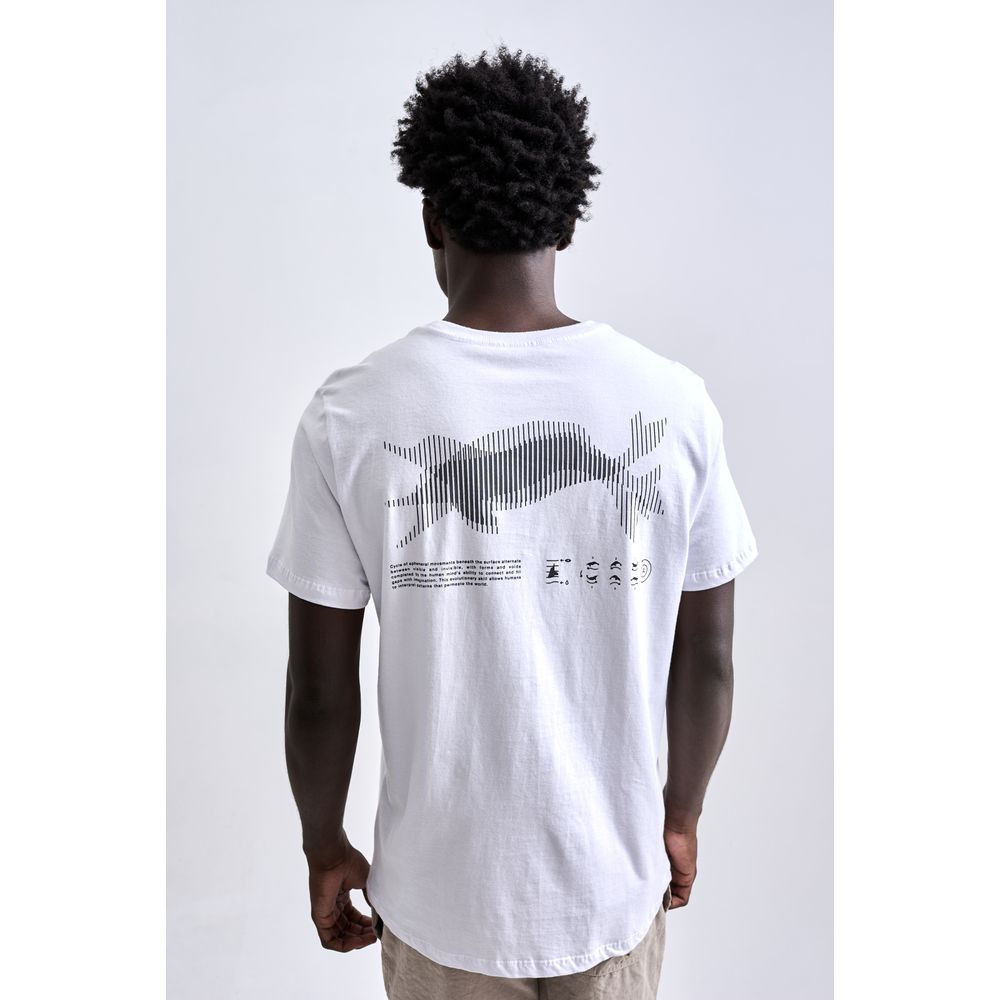 Camiseta em tecido 100% algodão penteado 30/01, pré-encolhida, pré-lavada e amaciada. A peça conta com reforços de costura na gola e nos ombros para melhor estrutura e durabilidade. A estampa é feita com tinta à base d’água, minimizando o impacto ambiental e reduzindo o uso de produtos químicos na confecção da peça.