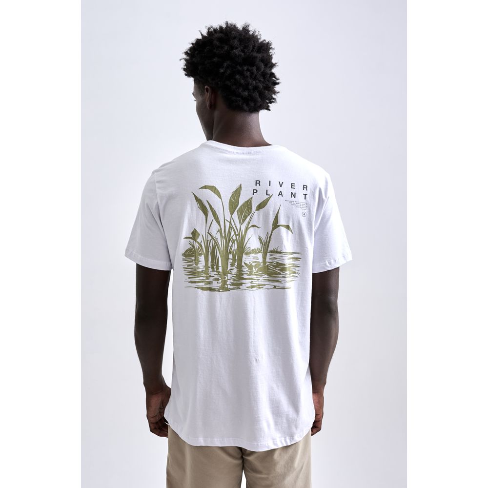 Camiseta em tecido 100% algodão penteado 30/01, pré-encolhida, pré-lavada e amaciada. A peça conta com reforços de costura na gola e nos ombros para melhor estrutura e durabilidade. A estampa é feita com tinta à base d’água, minimizando o impacto ambiental e reduzindo o uso de produtos químicos na confecção da peça.