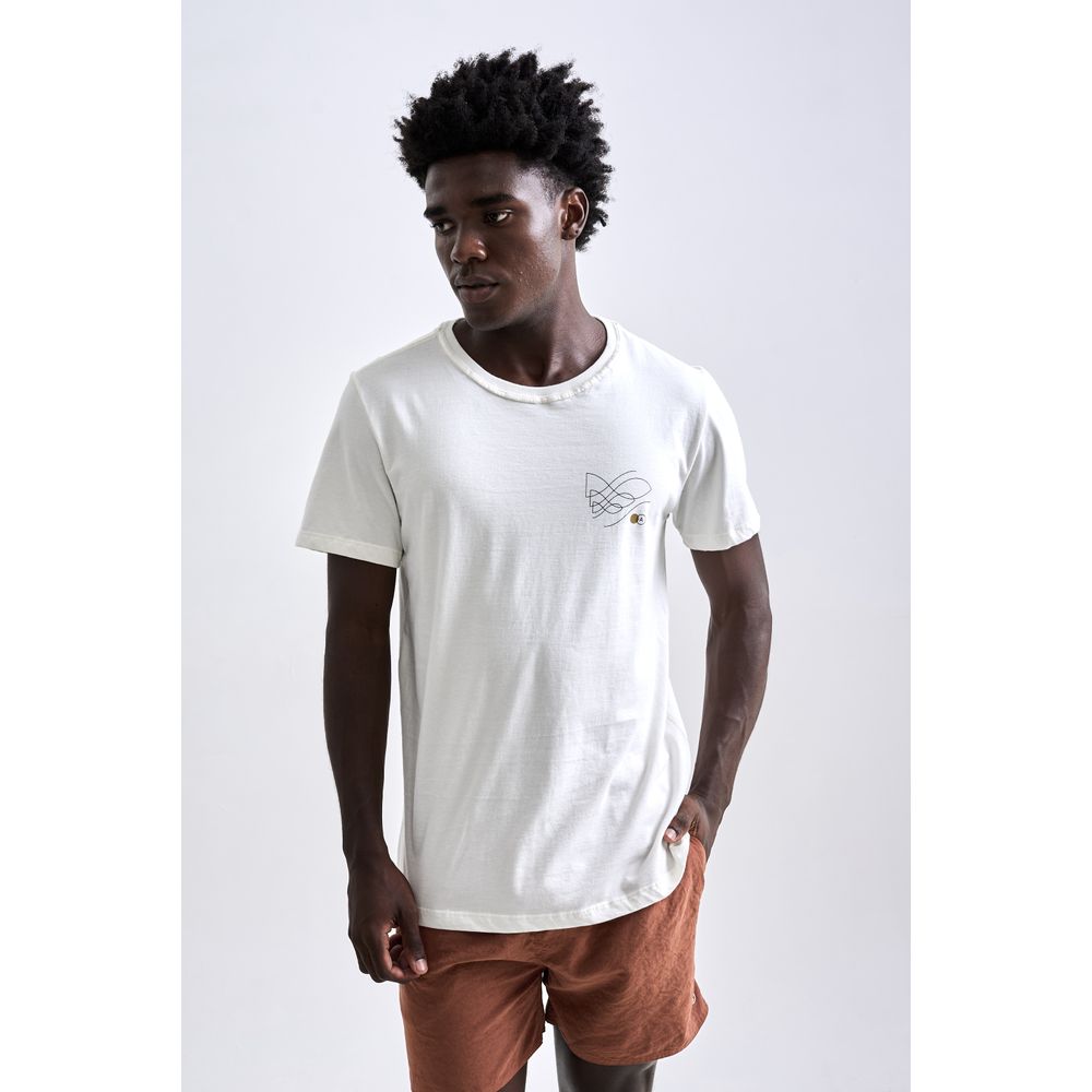 Camiseta em tecido 100% algodão penteado 30/01, pré-encolhida, pré-lavada e amaciada. A peça conta com reforços de costura na gola e nos ombros para melhor estrutura e durabilidade. A estampa é feita com tinta à base d’água, minimizando o impacto ambiental e reduzindo o uso de produtos químicos na confecção da peça.